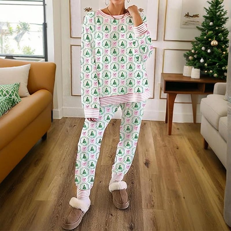 Women’s Christmas Pajama Set 🎄✨ – Festive Tree & Bow Print 🎀, Comfy Long Sleeve Top & Pants 🛌💤